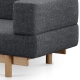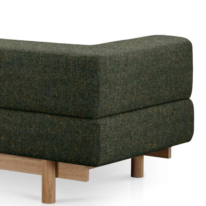 Le canapé minimaliste est chaleureux, avec sa base en bois, son assise en mousse haute densité recouverte de tissu Granola Silk (30% coton, 22% laine recyclée, 21% acrylique, 16% polyester, 10% soie). Canapé de style Japandi, qui mixe la simplicité japonaise et le confort naturel scandinave. Dans la même collection du studio Etc Etc, sont également disponibles les fauteuils, canapés trois places et canapés d'angle avec méridienne à gauche ou à droite, ainsi que les poufs.