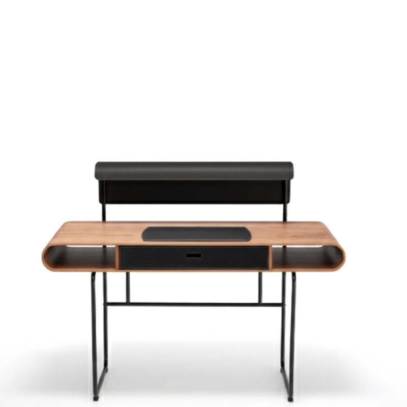 Demander un devis| Matériaux | Structure tubulaire en métal laqué noir. Plateau en noyer flammé, avec tiroir et sous main en cuir noir. |