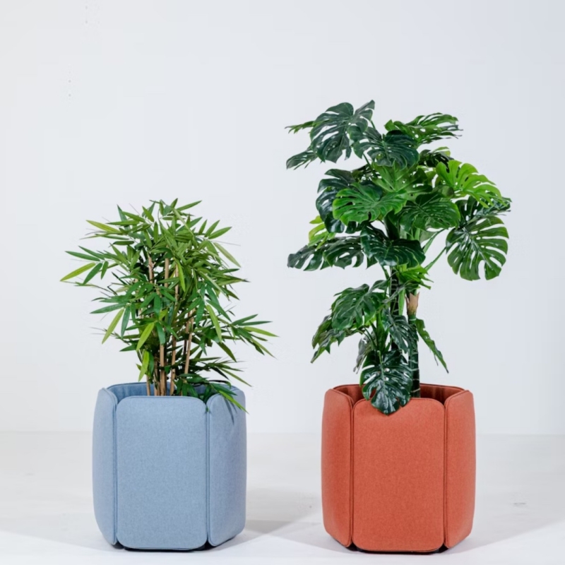Demander un devis| Matériaux | Jardinière avec réservoir d'eau. Recouverte de tissu Buzzifabric, feutrine issu de bouteilles de plastique recyclées. |