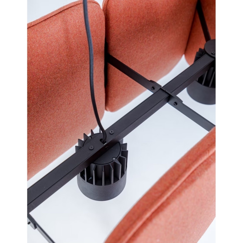 BUZZICHICLE est une suspension acoustique de grande dimension signée Buzzispace et conçue par Common Object Studio. Cette grande lampe suspendue, longue de 1,17 m pour 46 cm de profondeur et 40 cm de hauteur, est équipée d’un éclairage LED (spots 2700K, 3000K ou 4000K au choix) et compatible 1-10V ou avec un variateur DALI. Le luminaire acoustique convient aussi bien aux intérieurs résidentiels – lofts et pièces à grands volumes – qu’aux espaces publics tels que bars, restaurants, hôtels, collectivités ou open spaces.