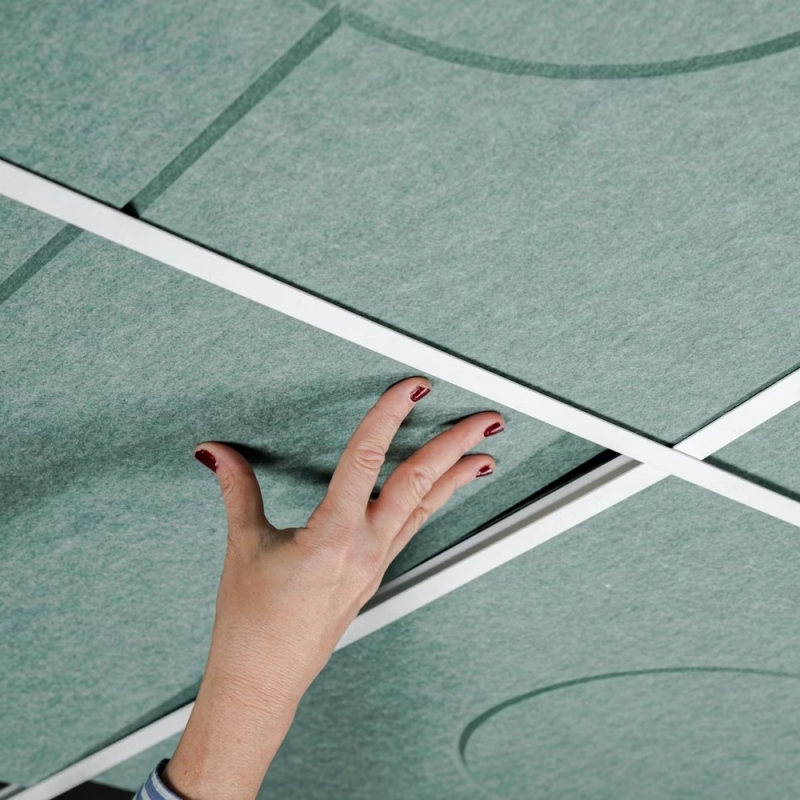 BUZZICLOUD est une collection de dalles acoustiques pour plafond T24 ou T15. De 59.5 cm de côté, les faux plafond acoustiques s'installent directement sur les grilles, sans outils. Plafond sans motifs ou avec 7 choix de relief (Rib, Maze, Parallel Up, Parallel Down, Geo, Cosmos, Abacus. Existe également avec motifs découpés 3D (avec supplément).