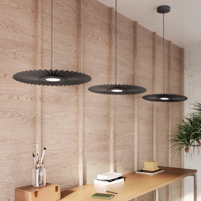 Eclairage led, avec un ruban led de 12W dans son disque central en métal laqué. Son abat-jour en tissu tissu plissé en PES ou Trevira CS de couleur anthracite. Le câble réglable textile mesure 2m de long.