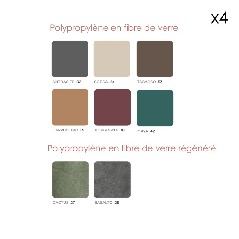 Demander un devis| Matériaux | Polypropylène fiberglass traité anti-UV et coloré dans la masse. Dans les versions Basalto et Cactus, polypropylène fiberglass régénéré (texture mate et brute avec trame). |
