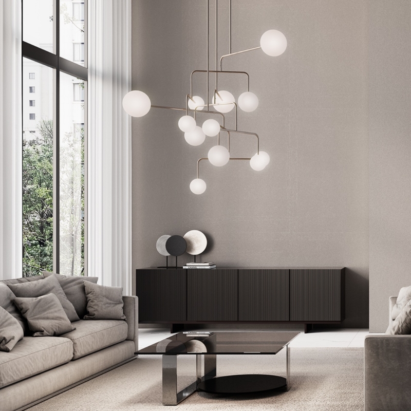Le lustre Constellation d’Alma Light, comprend 12 globes en verre triplex opale. Plafonnier design espagnol d'Alma Light ,inspiré à la fois des mobiles d’Alexander Calder et de Joan Miró, ainsi que de la fascination pour les constellations du cosmos. Plafonnier avec omposition asymétrique parfaitement équilibrée (les globes sont de différents diamètres de 18, 15 ou 12 cm). Selon le point de vue, la perception de la structure évolue, apportant une sensation de mouvement et de légèreté.