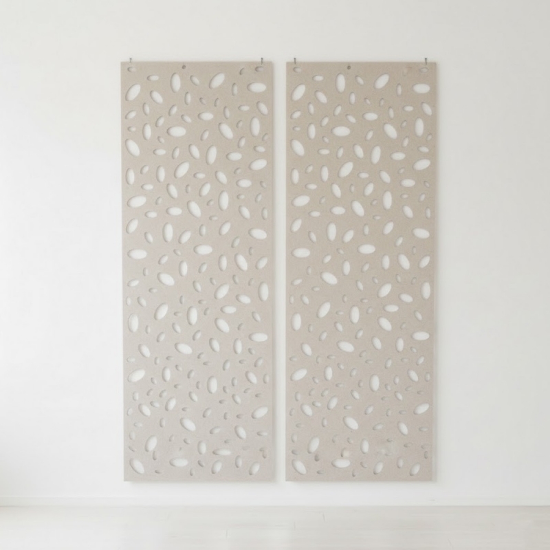 Les panneaux mesurent chacun 80 cm de large pour 2m65 de haut (2m45 ou 2m55 sur demande au 01 53 30 33 30). De 8 mm d'épaisseur, les panneaux réduisent considérablement les nuisances sonores dans open space, hôtels, bars, restaurants, coworking notamment. Joli panneau suspendu acoustique pour cloisonner l'espace de manière efficace et décoratif.