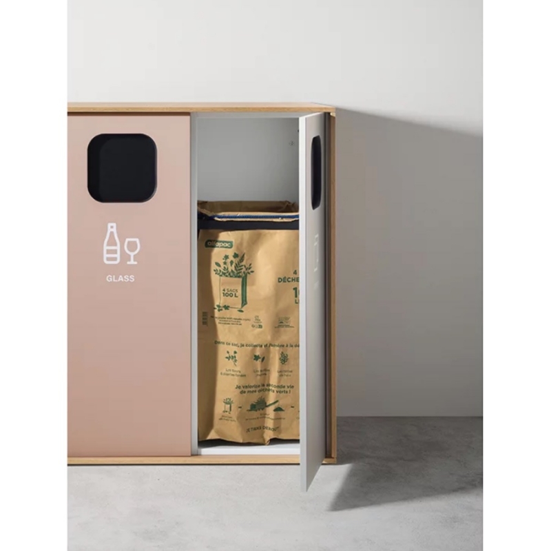 | Infos complémentaires | En option, bac de récupération, roulettes et stickers personnalisables (papier, plastique, verre, organique et déchets généraux). |