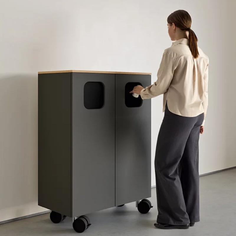 Leur design linéaire et compact, réalisé en mélaminé titane de haute qualité, garantit robustesse et durabilité. Grâce à leur modularité, les différents éléments ECOBOX peuvent être combinés pour créer un système de tri sur mesure. Chaque module de 40 cm de long, 43.2 cm de profondeur et 1m de haut est personnalisable selon le type de déchet — papier, plastique, verre, organique ou résiduel — avec en option des autocollants et accessoires adaptés, dont un bac intérieur en métal pour la collecte des liquides.