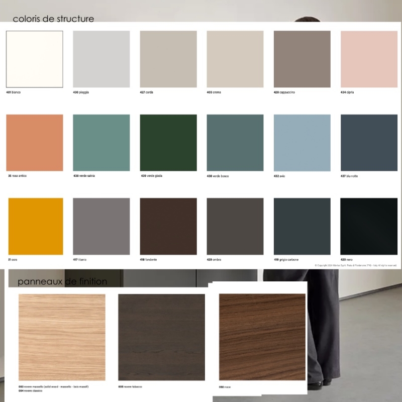 Demander un devis| Matériaux | Structure en mélamine titanio. Panneau de finition en chêne ou noyer de 14 mm d'épaisseur. |