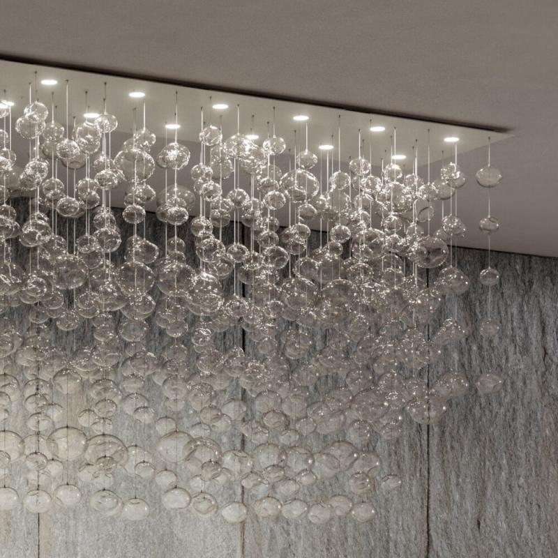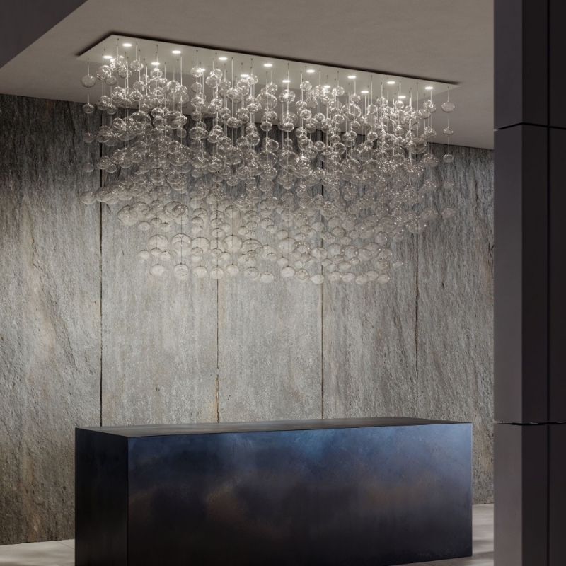 Le plafonnier design ETHER, imaginé par Patrick Jouin, se présente comme une véritable sculpture lumineuse. Avec sa silhouette aérienne, ce luminaire contemporain transforme l’espace. Sa suspension est réalisée en verre borosilicate transparent soufflé à la bouche. Chaque élément est façonné à la main et présente de fines irrégularités ainsi qu’un délicat effet martelé, faisant de chaque installation une pièce unique et renforçant le caractère exclusif de ce luminaire haut de gamme.