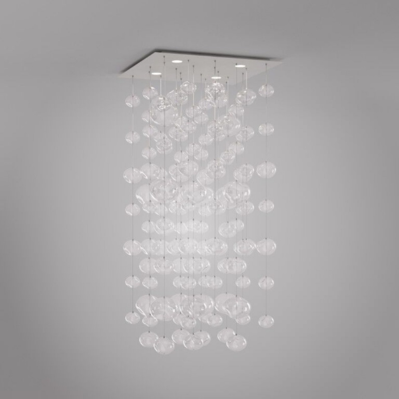 La version Ether S 150 D est équipée d’un éclairage LED - 5 modules de 8,7 W (soit 43,5 W au total). Elle délivre un flux lumineux nominal de 4580 lumens en 3000 K. Compatible avec les systèmes de variation Push-dim, 0/1-10V et DALI, ce plafonnier moderne répond aussi bien aux exigences des projets résidentiels que contract. Sa structure en métal finition blanc mat (59 × 59 × H5 cm) supporte une composition totale de 70 × 70 × H150 cm. Cette suspension design peut également être réalisée sur mesure afin de s’adapter à différents projets d’aménagement.