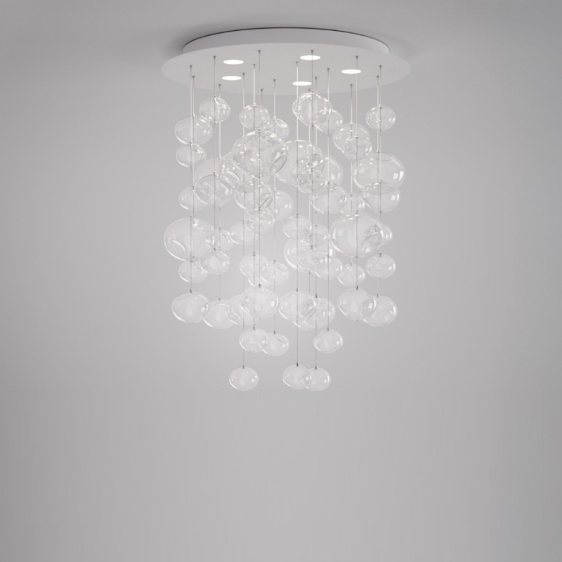 Conçue par Patrick Jouin, la suspension ronde Ether est une oeuvre d'art lumineuse qui transforme l’espace par sa présence aérienne et sculpturale. Le plafonnier design se compose d’une cascade de sphères en verre borosilicate soufflé transparent. Chaque élément, façonné à la main, présente de délicates irrégularités et un léger martelage unique, rendant chaque composition absolument singulière.