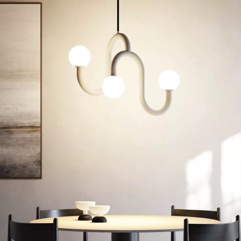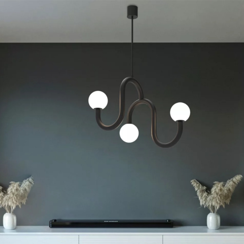 Une grande suspension minimaliste de style Memphis. De 72 cm de long pour 36 cm de large et 64 cm de haut. la suspension dispose d'un câble de 1m50, ainsi que d'une rosace de 87 cm de diamètre et 8 cm de haut. Dans la même collection, découvrez l'applique.