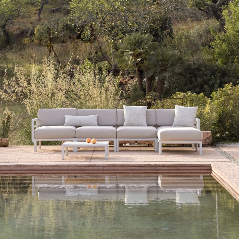 La collection MAXIMO se distingue par sa grande modularité : l’ensemble des éléments — dossiers, accoudoirs, tablettes, poufs et coussins — est entièrement amovible et se fixe facilement, permettant de composer librement un salon d’extérieur personnalisé.
