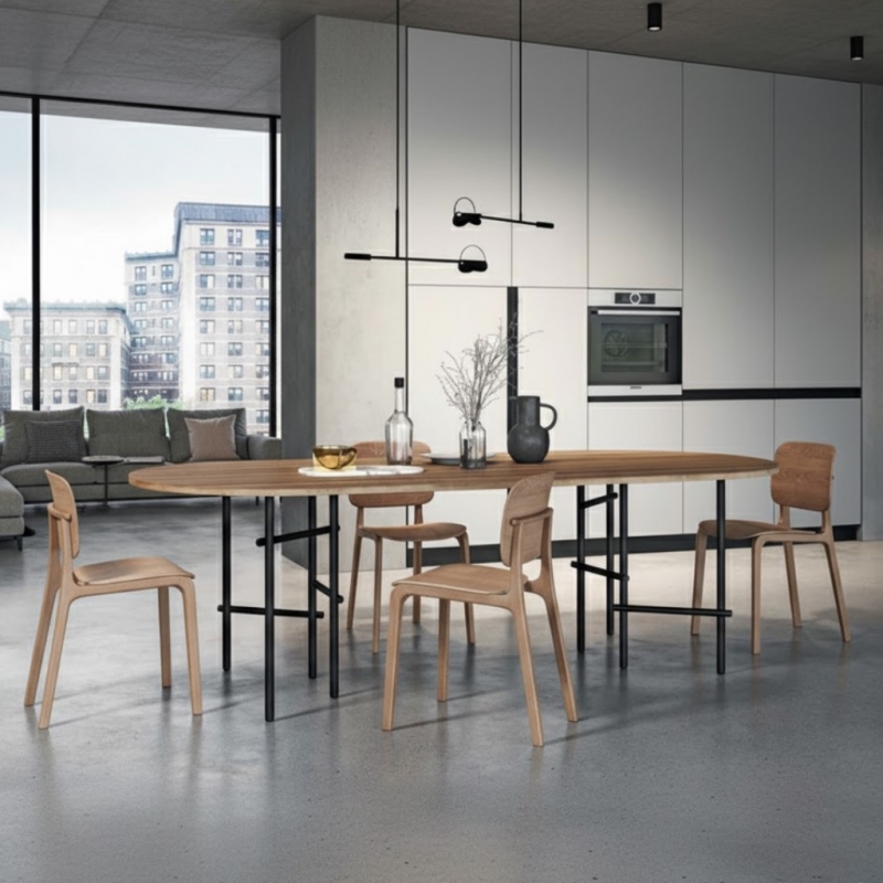 Table ovale design RAMI de la marque Infiniti. Dans la plus pure tradition de design italien, des formes originales, de matériaux haut de gamme. La table à manger moderne a un piètement moderne en métal laqué noir. Celui ci a été dessiné pour que les convives en bout de table n'aient pas les jambes coincées en bout de table. Plateau en chêne naturel.