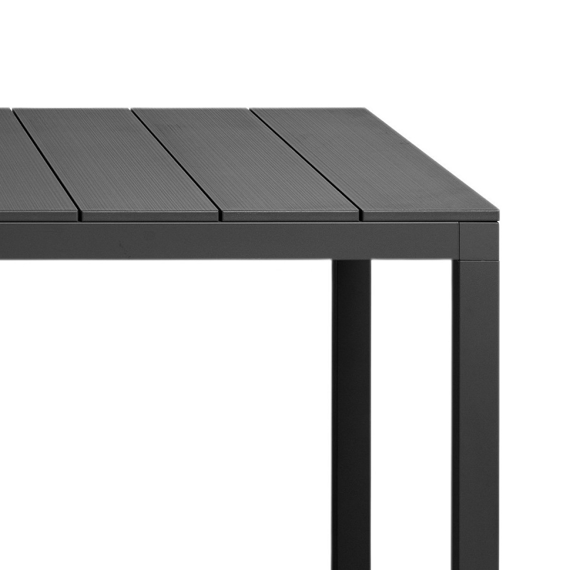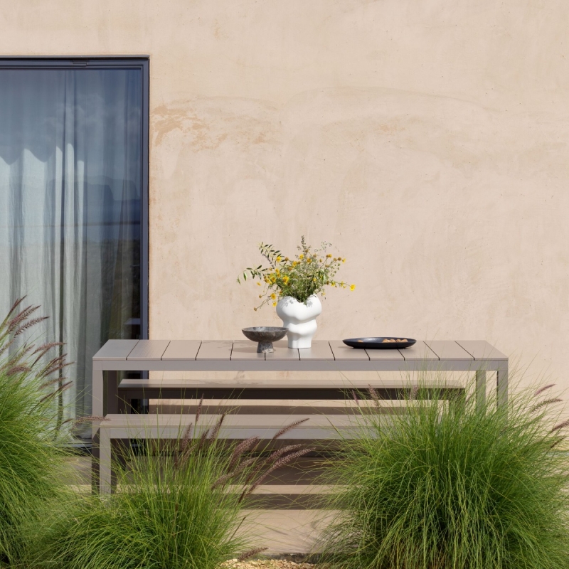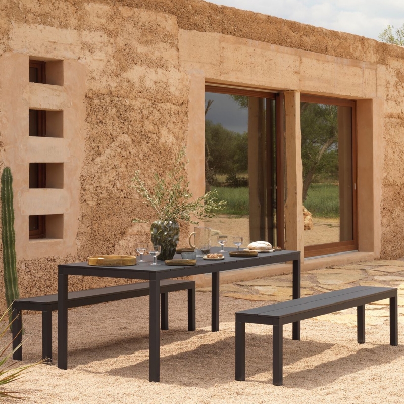 Table minimaliste d'extérieur, architecturale et fonctionnelle de 2m10 de long pour 85 cm de large et 75 cm de haut. La table de jardin à lattes pour être complétée du banc en aluminium. La table existe aussi en versions extensibles.
