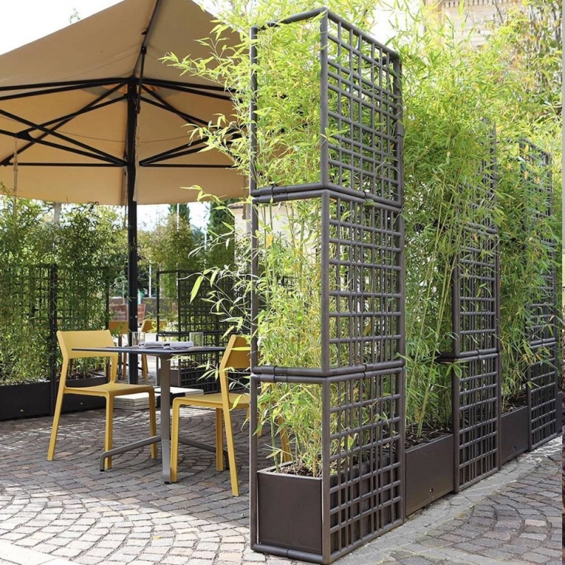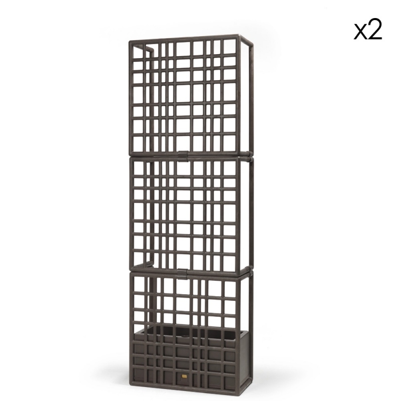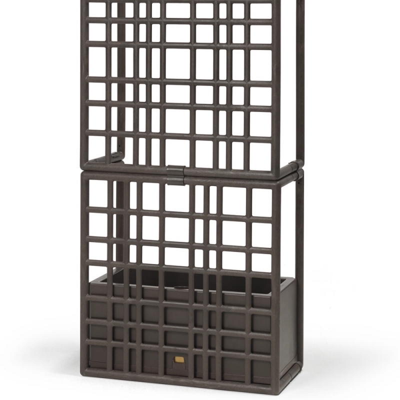 Pour assurer la stabilité de l’ensemble, la jardinière doit être lesté avec au moins 30 kg. Sipario 3 est une claustra fabriquée en polypropylène fiberglass régénéré, traité anti-UV, coloré dans la masse, avec un effet mat. La résine est résistante, durable et recyclable. Elle est disponible en finitions terre, gris clair, cactus et basalte.
