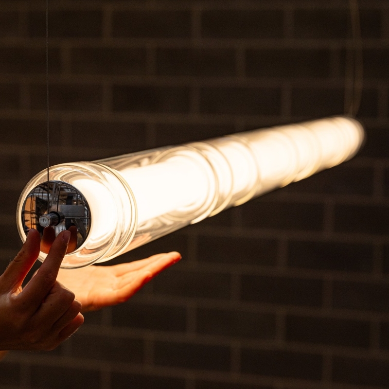 STACKING S 120 H est une suspension led compatible variateur DALI. Suspension design italien en verre soufflé et structure aluminium fabriquée artisanalement en Italie par Leucos. De 120 cm de long, et 10 cm de diamètre, on adore cette lampe horizontale minimaliste idéale au dessus d'un comptoir de cuisine, salle à mange, salon, mais aussi pour espaces publics (bars, restaurants, hôtels notamment).