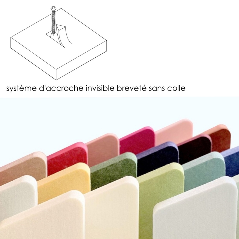 TABULA est une dalle murale acoustique géante de la marque Impact Acoustic. De 15, 30 ou 60 cm de large pour 2m40 de haut (épaisseur 24 mm) ou 2m80 de haut (épaisseur 12mm). Les panneaux acoustiques longs s'installent au mur sans colle, mais grâce à un système breveté de fixation invisible. Cette dalle acoustique se monte ensemble pour former une grande composition murale, et donc un absorbeur de bruit impressionnant.