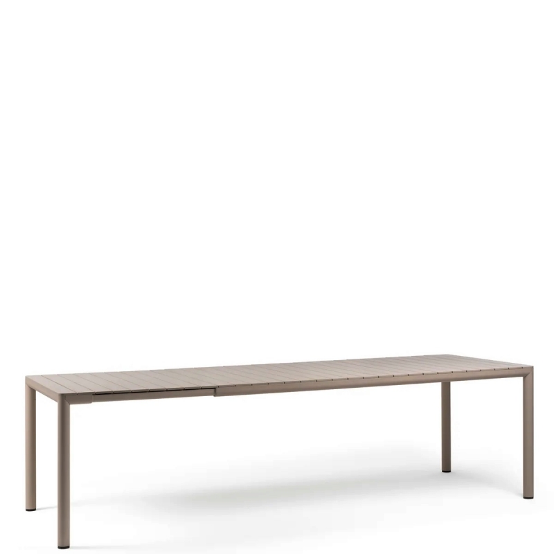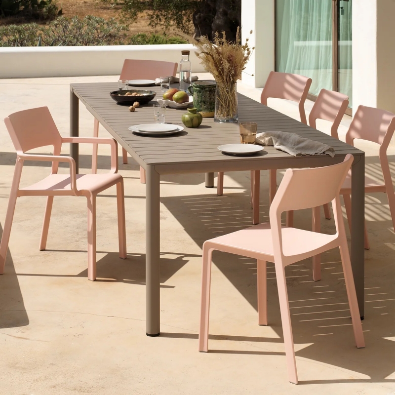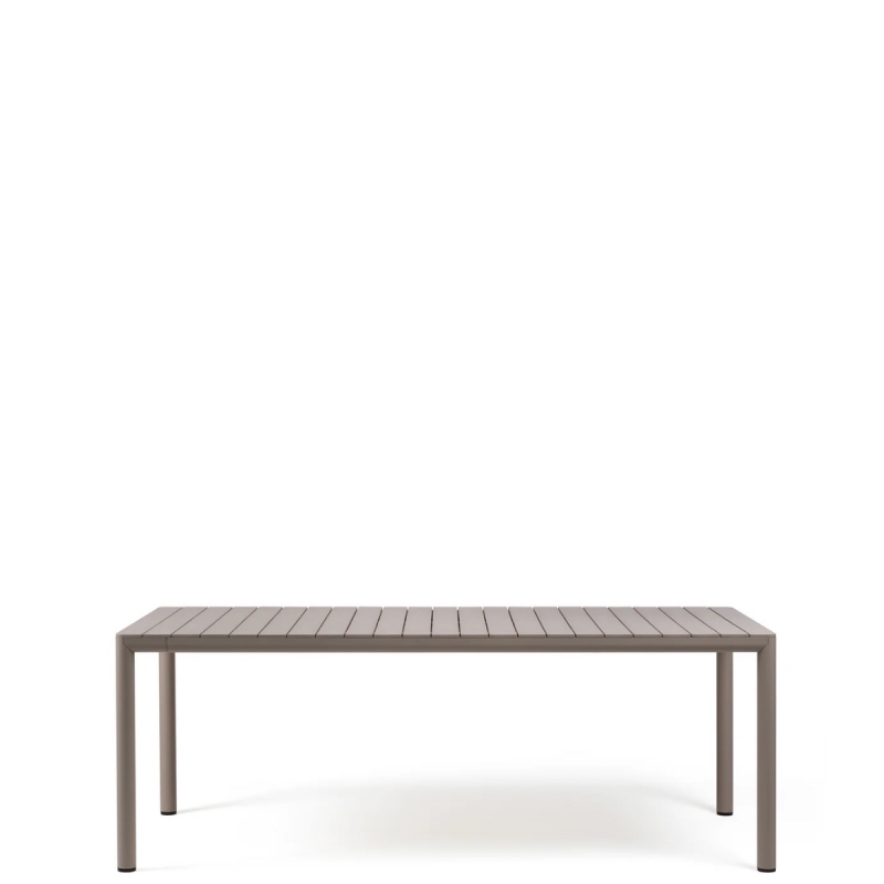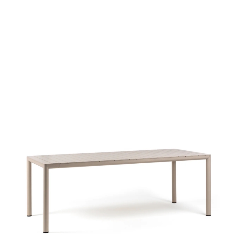 TEVERE 210 est une table extensible d'extérieur de 10 à 12 personnes. Table de jardin extensible de design italien, de la marque Nardi. La table dispose d'un pateau en polypropylène fiberglass traité anti-UV et coloré dans la masse. Structure en aluminium vernis mat. Dans la version marron, polypropylène fiberglass régénéré (texture mate et brute avec trame). Table design écologique avec lignes douces, qui sur l'absence d'arêtes et les formes arrondies des pieds.