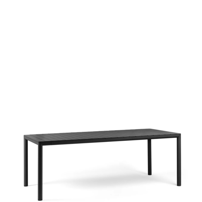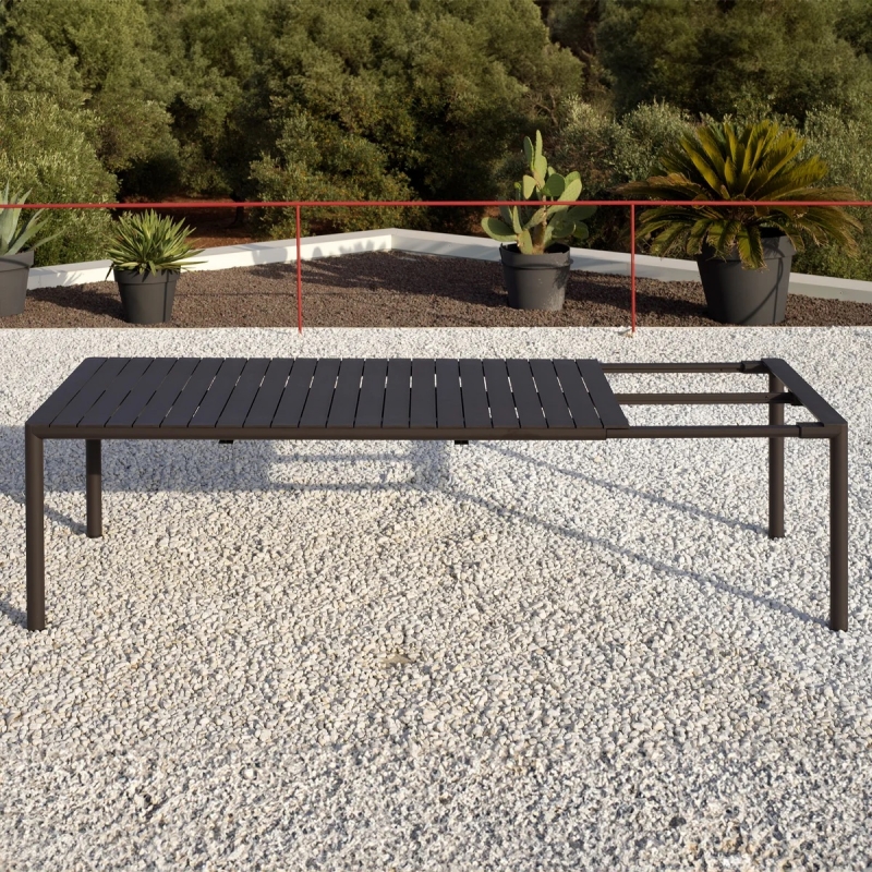 La table dispose d'une allonge sous le plateau, pour passer de 2m11 à 2m75. De 1m de large et 76 cm de haut. La table de jardin design est déclinée en corda (crème), tortora (taupe), anthracite ou marron. Dans la version marron, polypropylène fiberglass régénéré (texture mate et brute avec trame).