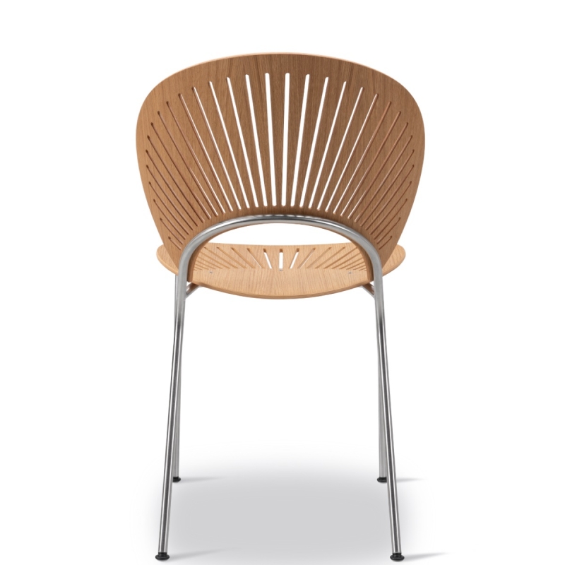 L’assise et le dossier en chêne apportent chaleur et naturel, tandis que le piètement chromé crée un contraste contemporain. Chaise intemporelle, capable de s’intégrer aussi bien dans un intérieur moderne que dans un espace plus classique. Chaise confortable, fonctionnelle et sculpturale.
