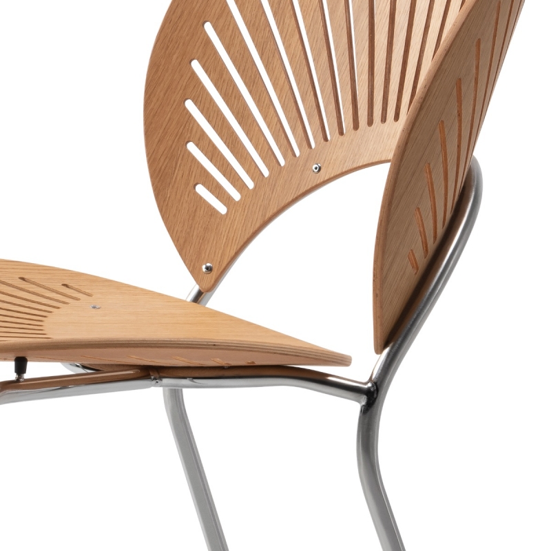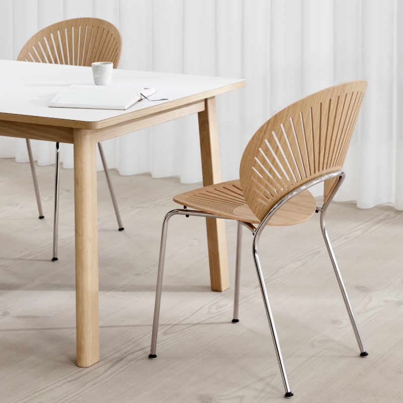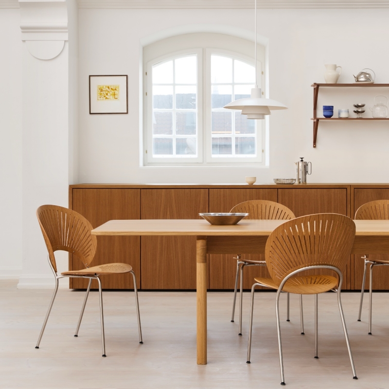 La chaise Trinidad de Fredericia, dessinée en 1993 par la designer danoise Nanna Ditzel, est devenue une chaise emblématique du design scandinave contemporain. Inspirée des délicates boiseries ajourées des façades dites Gingerbread, observées lors de ses voyages dans l’architecture coloniale de Trinidad. Cette référence se retrouve dans le dossier finement découpé, dont le motif ajouré joue avec la lumière et les ombres, projetant dans l’espace un graphisme subtil et vivant qui donne à la chaise une impression de légèreté.