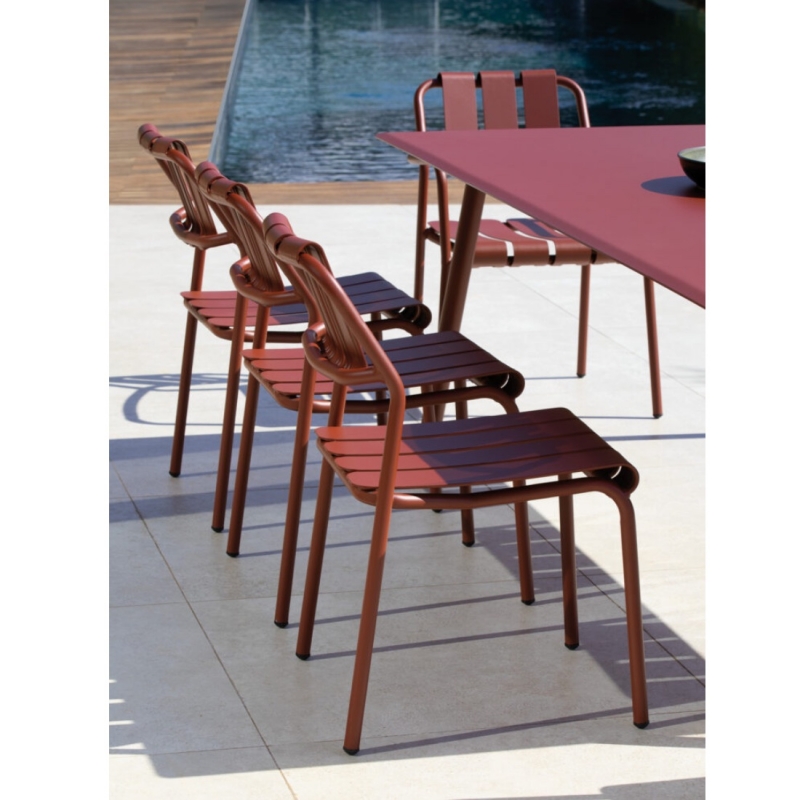 VERDEA est une chaise de jardin design italien de Vermobil. Chaise d'extérieur ou d'intérieur en aluminium thermolaqué, avec veni label Qualicoat, qui garantit à cette assise une résistance extrême aux intempéries, UV et chocs. Chaise empilable, minimaliste, ergonomique avec en option possibilité de lui ajouter un coussin d'assise (tissu acrylique finition teflon, antidéperlant, anti moisissure, résistant aux UV), pour encore plus de confort.