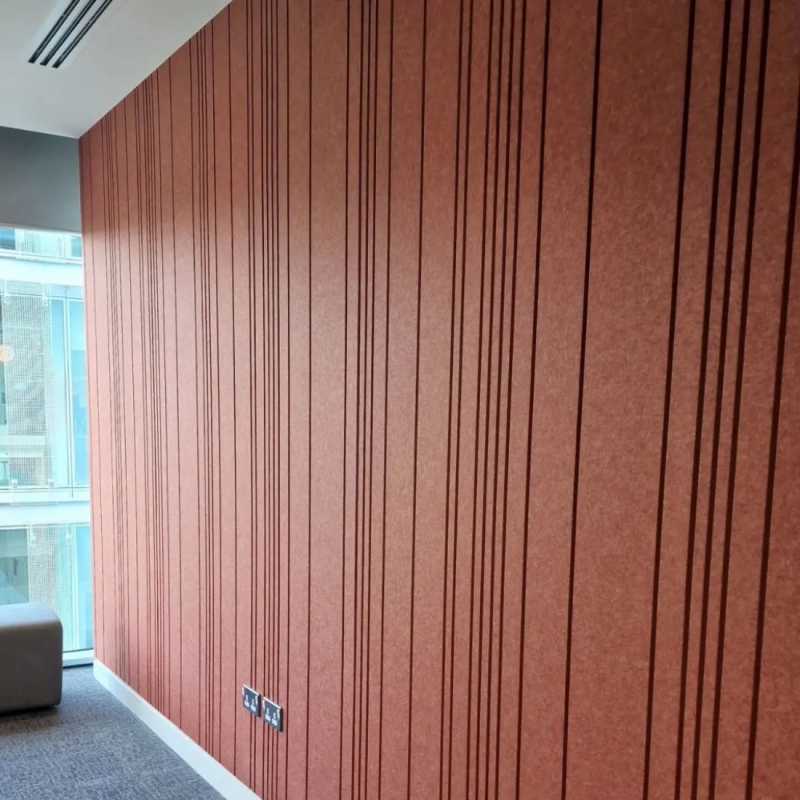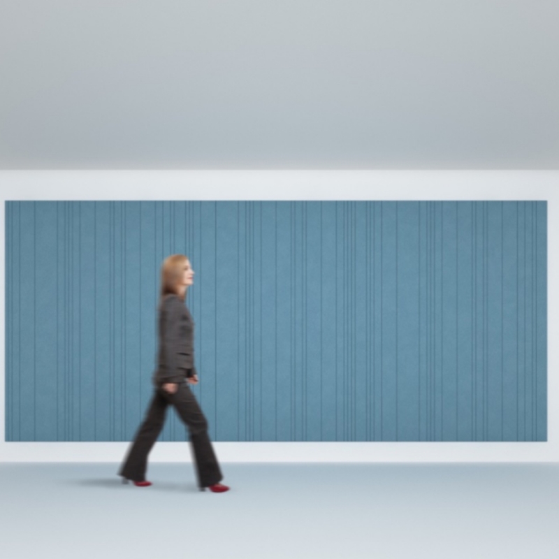 Disponible en deux dimensions — 120 x H280 cm (12 mm) ou 180 x H240 cm (24 mm) — le panneau acoustique habille les murs avec raffinement. Son système de fixation invisible, breveté et sans colle, garantit une installation propre et durable. Assemblés côte à côte, les panneaux dessinent une composition verticale graphique et insonorisante.