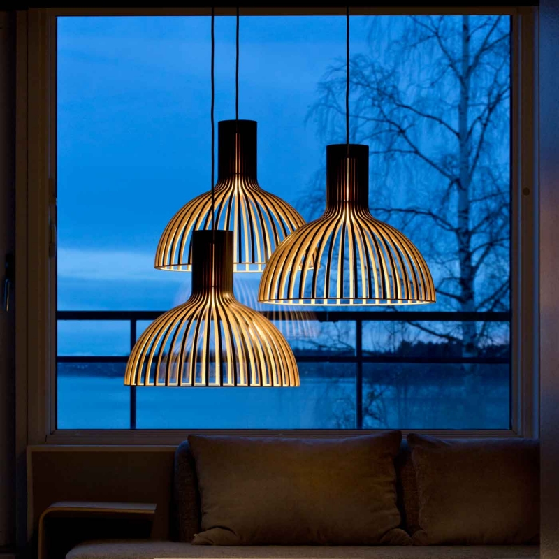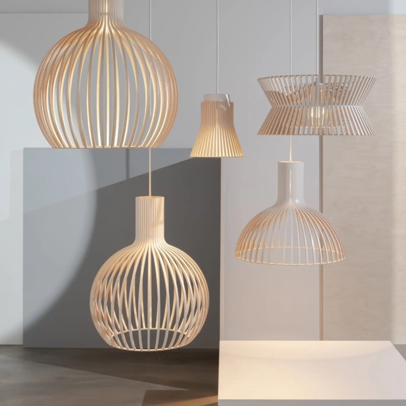 Fabriquée à la main par des artisans hautement qualifiés, à partir de bouleau finlandais certifié, la suspension Victo 4251 est une pièce sculpturale de 45 cm de diamètre pour 39 cm de hauteur. Imaginée par Seppo Koho et éditée par Secto Design, elle se décline en quatre finitions : bouleau naturel, mélaminé noir, blanc ou placage noyer. Les lattes qui composent son abat-jour sont assemblées par des anneaux en aircraft plywood, un matériau utilisé en aéronautique pour sa résistance exceptionnelle à la chaleur.