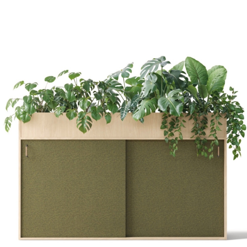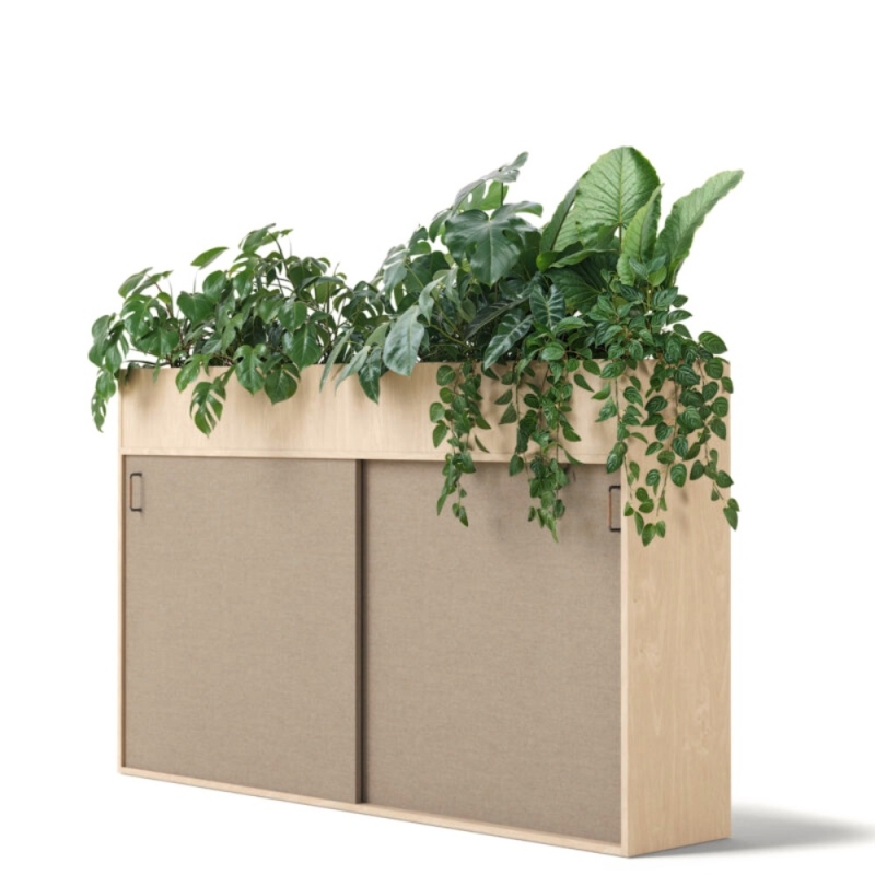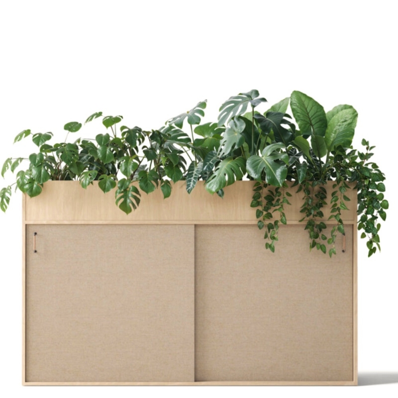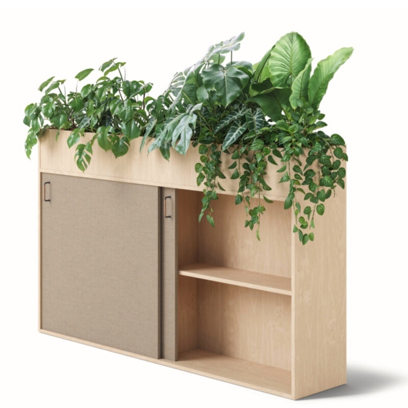 Polyvalent, ce meuble de rangement acoustique peut accueillir, au choix, des bacs à plantes, des plantes naturelles ou artificielles, ainsi que des objets décoratifs, catalogues ou livres sur son plateau supérieur.